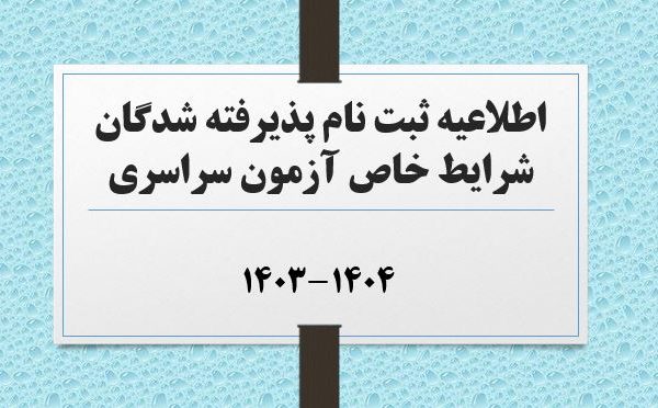 اطلاعیه ثبت نام پذیرفته شدگان شرایط خاص آزمون سراسری 1404-1403روابط عمومی معاونت آموزشی30 دی 1403اطلاعیه ثبت نام پذیرفته شدگان شرایط خاص آزمون سراسری 1404-1403 معاونت آموزشی دانشگاه ... اطلاعات بیشتر